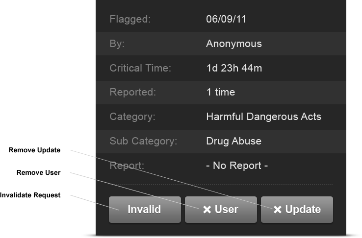 Users can easily flag any post and select from a list of categorized options. Users can also submit a message along with the report. The report automatically appears in the CMS grid once received. A moderator can quickly address the issue by deleting the update, user or ignoring the request.